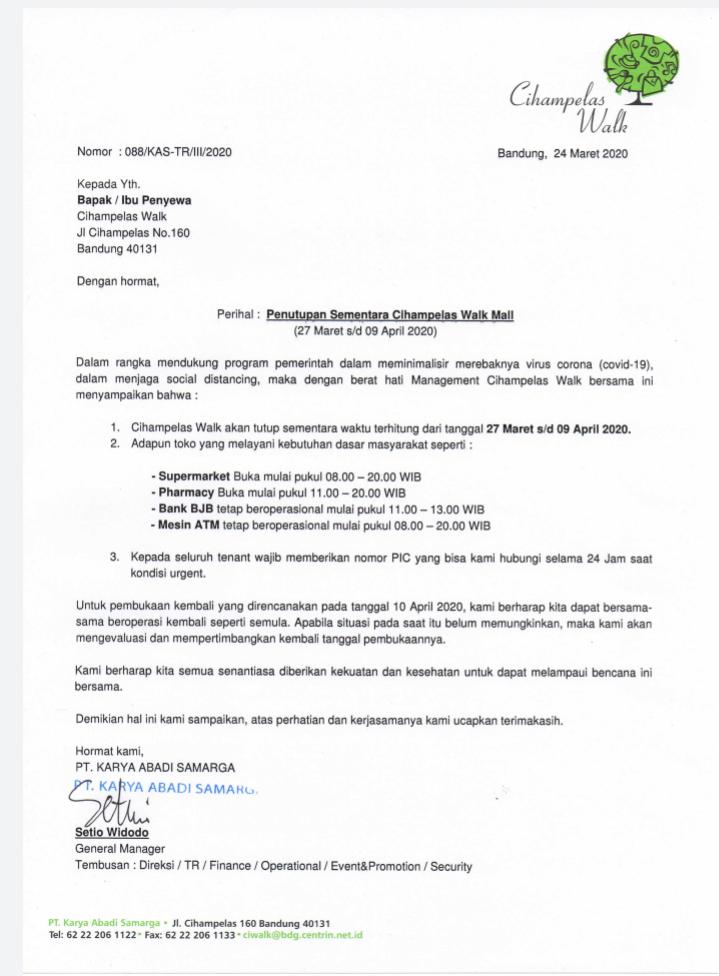 “Dear, our beloved customer ,Sebagai bentuk dukungan penuh terhadap kesehatan bersama, Ciwalk akan tutup dulu ya sementara mulai tanggal 27 Maret – 9 April 2020 (terkecuali Yogya supermarket, Watson, Century, Guardian, Bank BJB dan ATM Center)” bunyi akun@cihampelaswalk