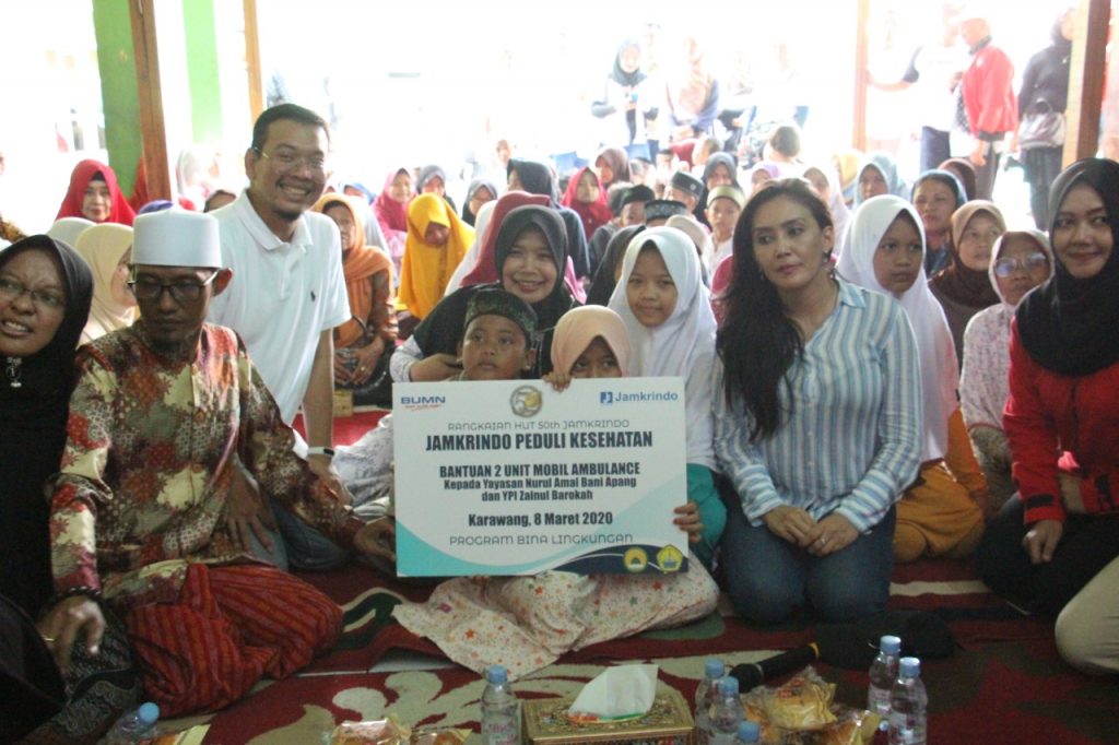 Karawang – PT Jamkrindo (Persero) menyerahkan Bantuan 2 unit Kendaraan Ambulance kepada Yayasan Nurul Amal Bani Apang dan YPI Zainul Barokah, Kabupaten Karawang, Jawa Barat. Sebagai salah satu kegiatan HUT ke-50 dalam aktivitas sosial Jamkrindo Peduli Kesehatan.
