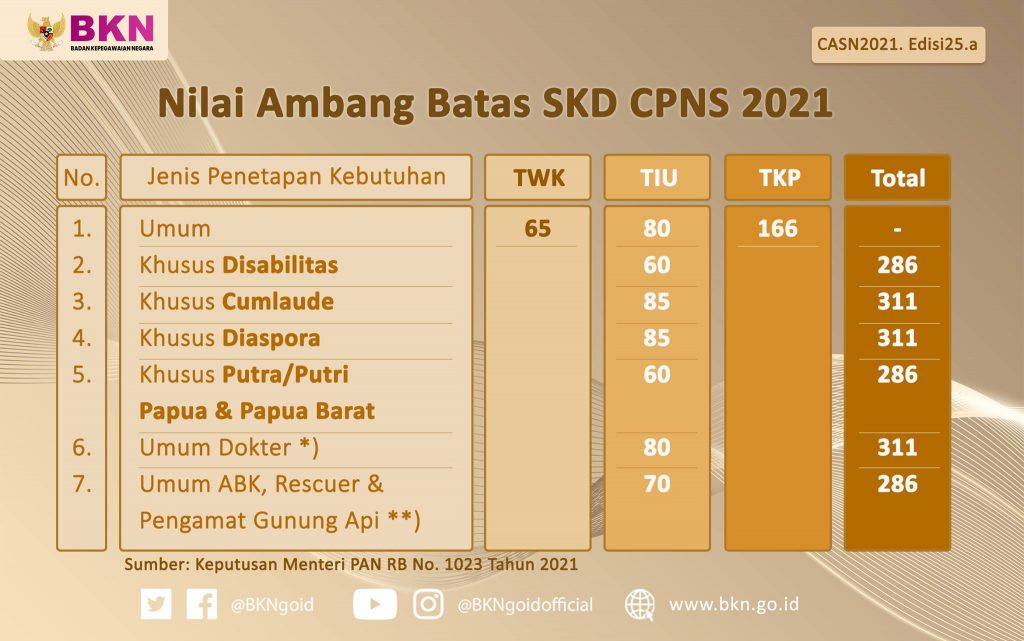 Jakarta – Bagi kalian yang lolos seleksi administrasi CPNS 2021 dan lanjut tahapan Seleksi Kompetensi Dasar (SKD) CPNS agar lolos tahap selanjutnya. Perhatikan nilai ambang atau passing grade batas minimun SKD CPNS 2021 berdasarkan Keputusan Menteri PANRB Nomor 1023 Tahun 2021 tentang Nilai Ambang Batas Seleksi Kompetensi Dasar Pengadaan Pegawai Negeri Sipil Tahun Anggaran 2021.
